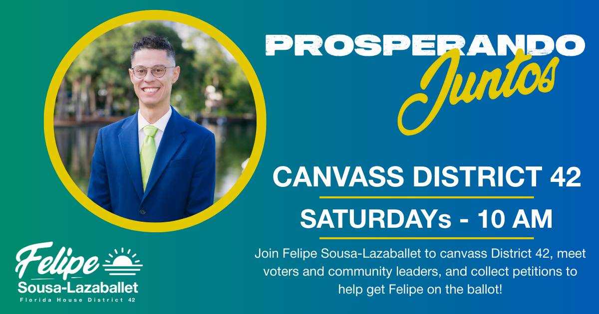 Join Felipe Sousa-Lazaballet to canvass District 42! Meet voters from across Orlando, collect petitions to help get Felipe on the ballot, and spread the word about this powerful, grassroots campaign.
