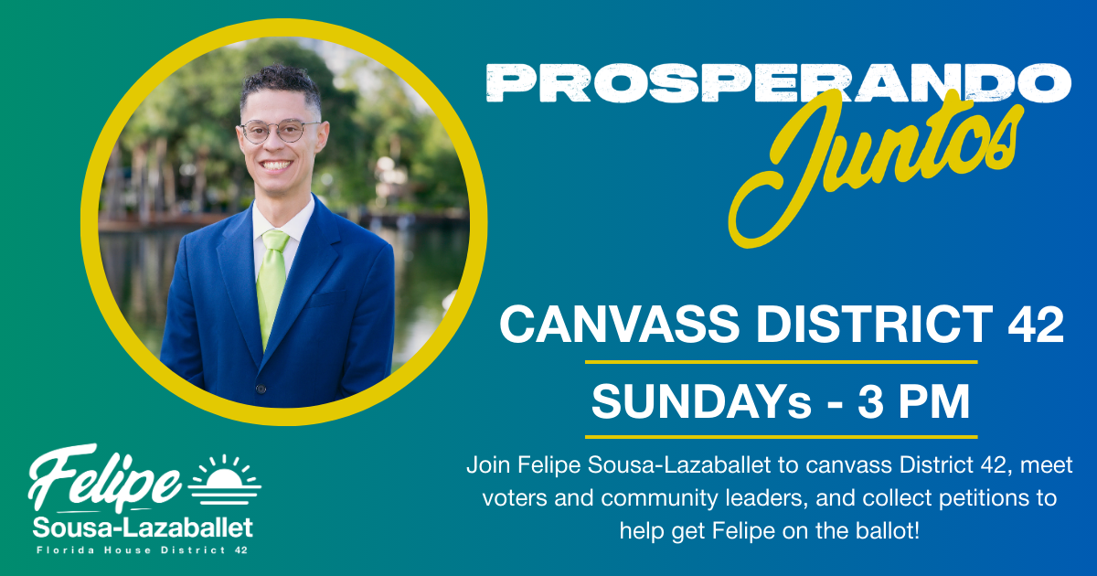 Join Felipe Sousa-Lazaballet to canvass District 42! Meet voters from across Orlando, collect petitions to help get Felipe on the ballot, and spread the word about this powerful, grassroots campaign.